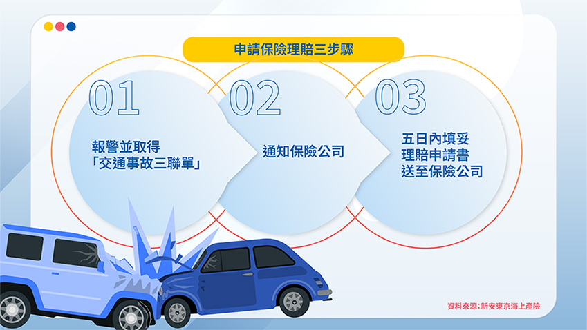 :請駕駛及乘客移到較安全的地方,並撥打電話,如果現場有人員傷亡,勿任意移動,請撥打119;若無人受傷,則撥打110